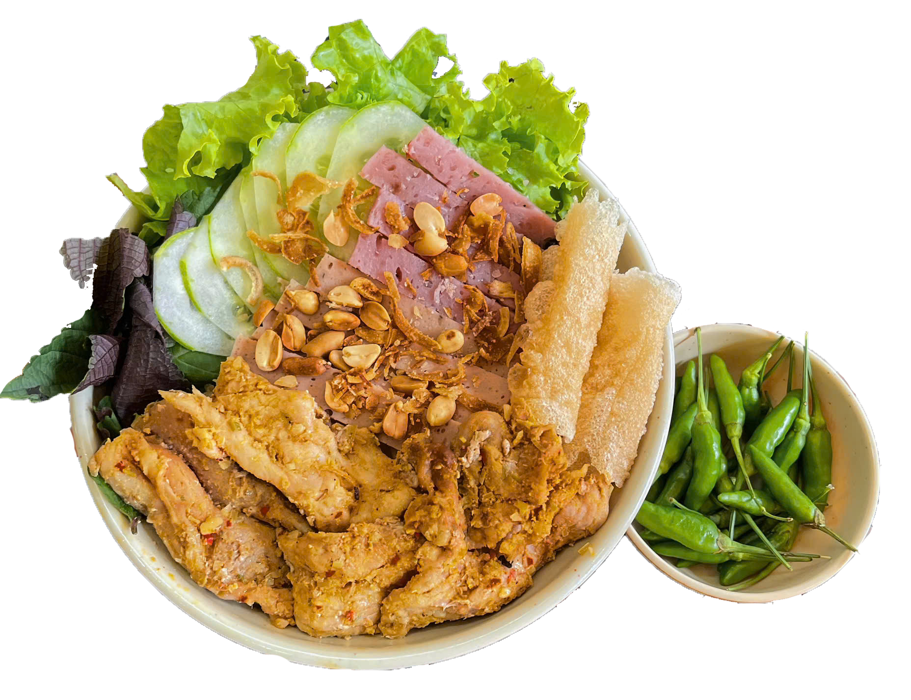 Thịt lụi, trứng, chả ram, nem chua, chả lụa, dưa leo, xà lách, bún.