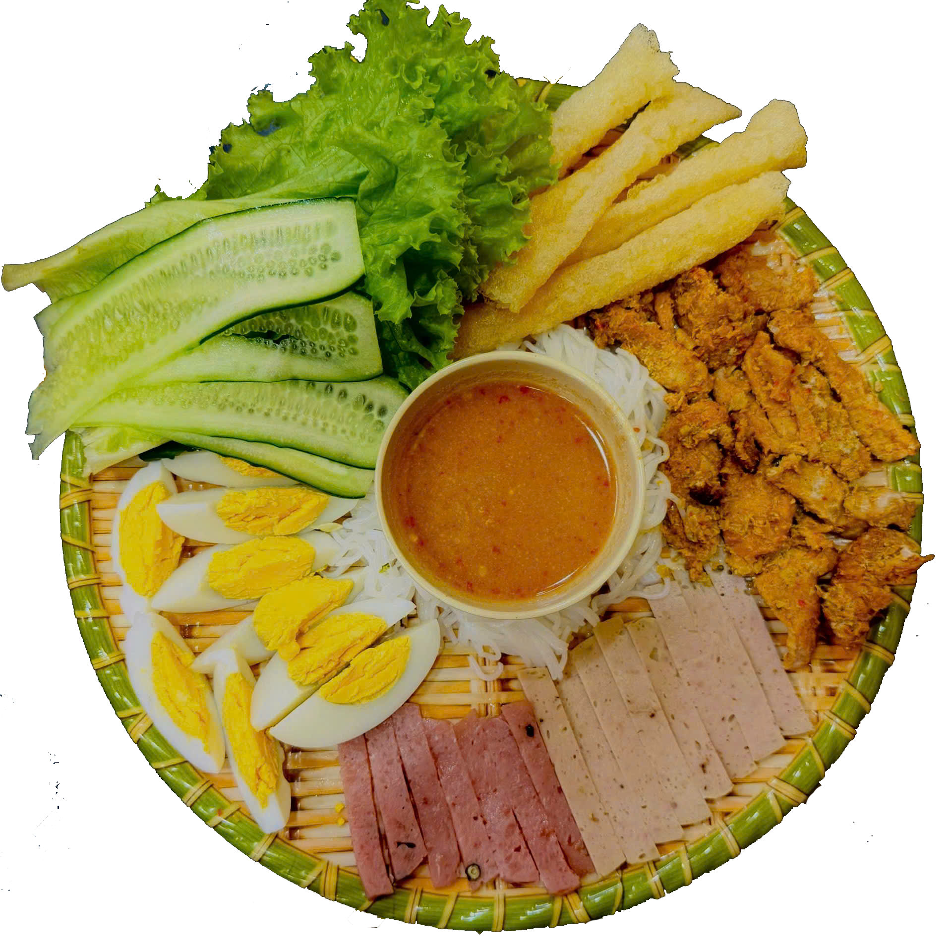 Thịt lụi nướng, nem chua, chả lụa, trứng, chả ram, dưa leo, rau.
